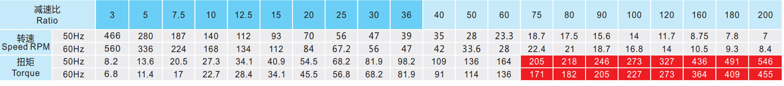 ▲ 表列轉(zhuǎn)速是基于電機(jī)異步轉(zhuǎn)速(50Hz:1400r/min、60Hz:1680r/min),額定負(fù)載時,實(shí)際轉(zhuǎn)速為表列轉(zhuǎn)速的80%-98%。